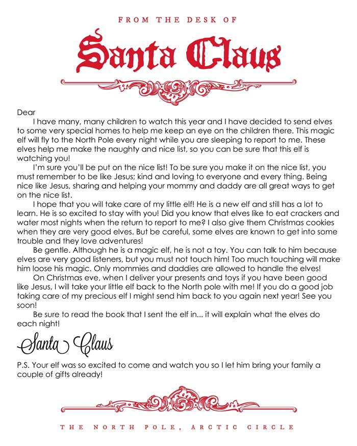 Elf On The Shelf Letter From Santa Template. But to be able to carry the letters, they must be just the right size for an elf. Responding to each letter that makes its way to his mail room grotto is a big task—even for Santa! taking into account searching for a template, search for explicit template as indicated by what you will habit to make. In the matter that you don't have a requirement for some, blossoms, discover a template you can use rather, in this freshen setting aside cash beyond the long haul. Figure out how to assume a gander at your making somewhat more extensive, particularly in the things you buy.